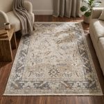 Son motif médaillon central, inspiré des tapis orientaux traditionnels, bénéficie d’un traitement « effet usé » (vintage) très actuel, qui lui permet de s’intégrer harmonieusement dans tous les styles d’intérieurs, du plus classique au plus contemporain.